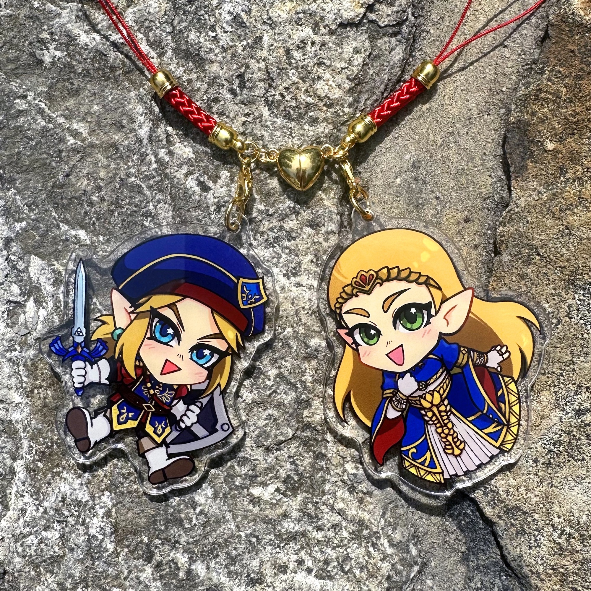 2.5 inch double sided charms of Royal Guard Link and Royal Gown Zelda from Breath of the Wild! The charms can be connected by their magnetic heart clasps!