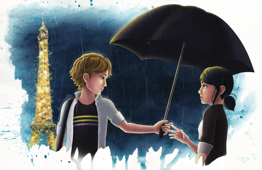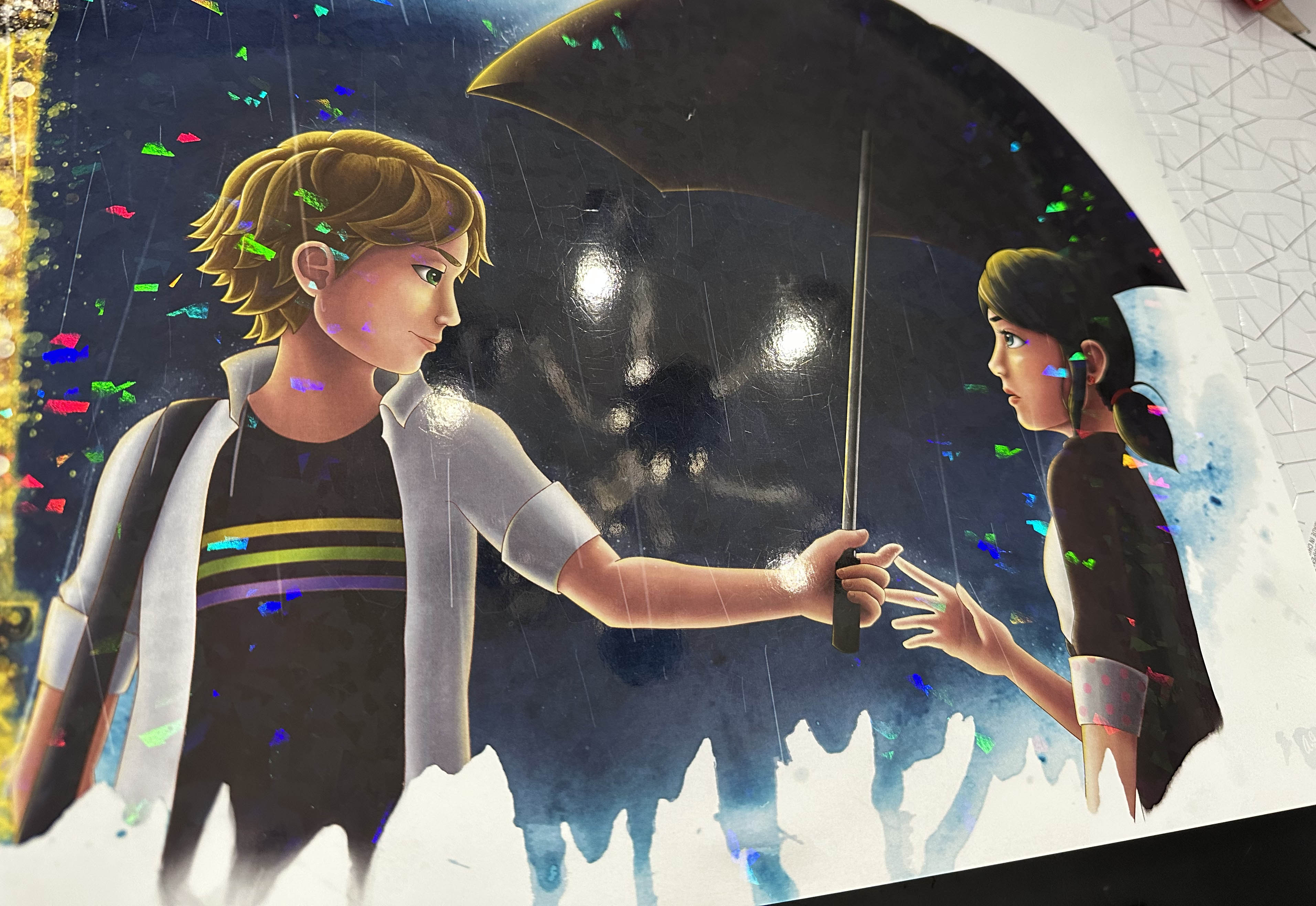 An 11x17 Holographic Print of Adrien and Marinette In the rain from the famous umbrella scene. Colors may vary slightly upon printing.