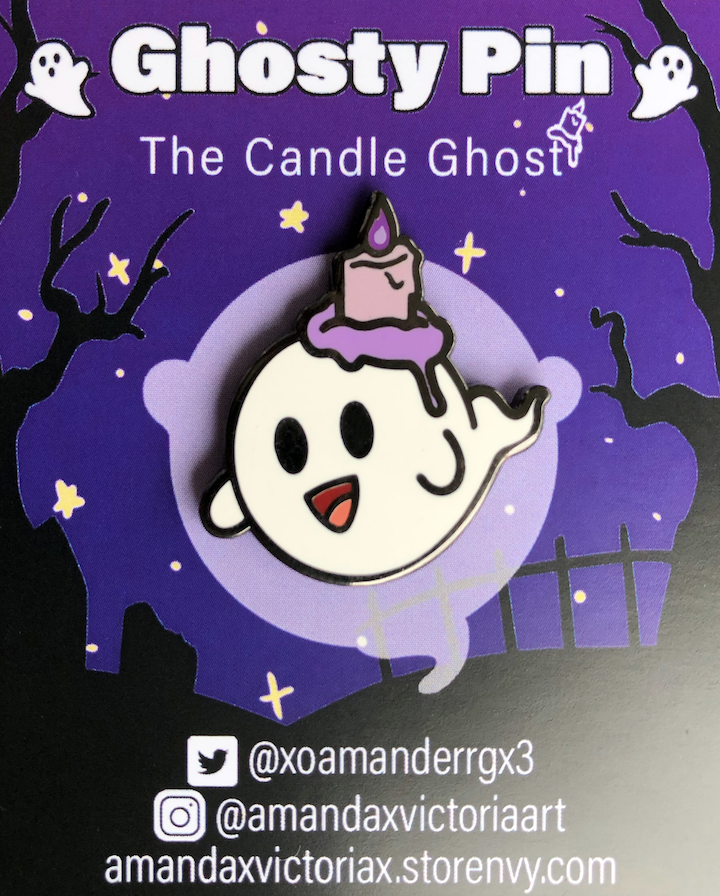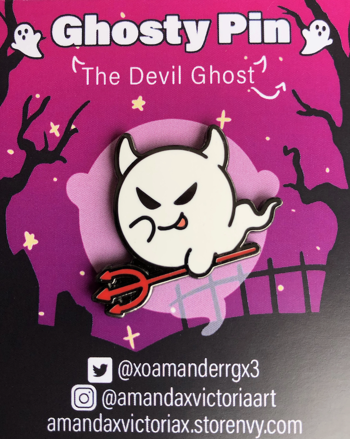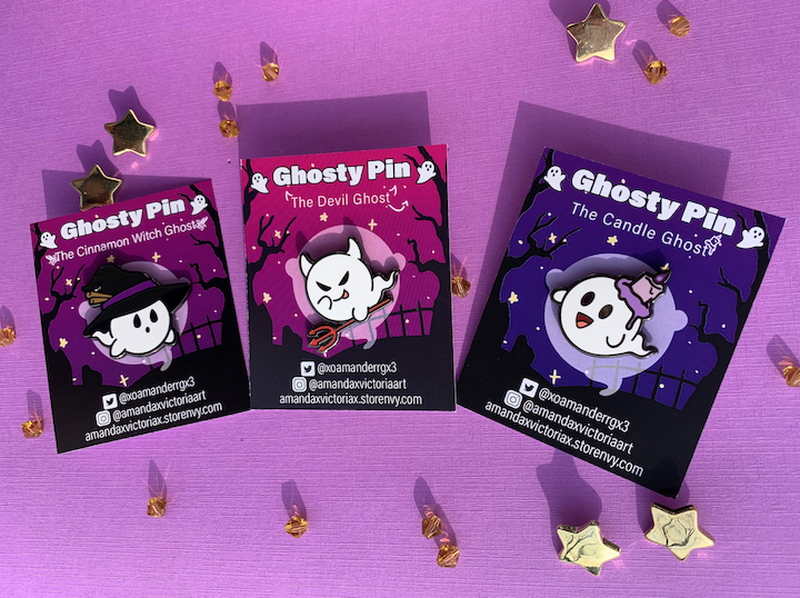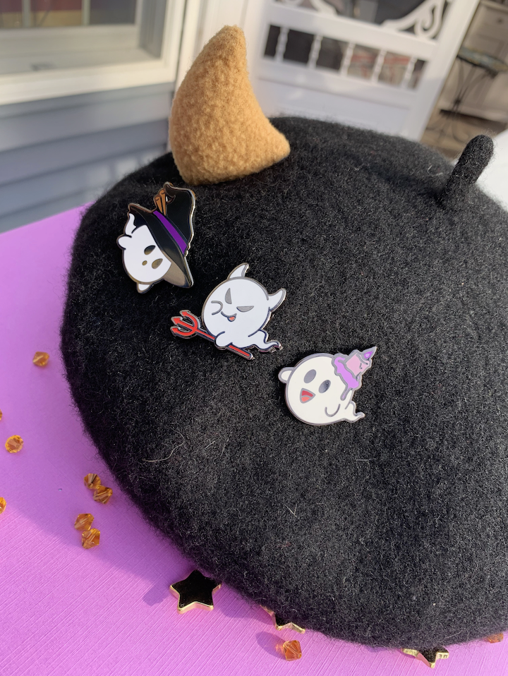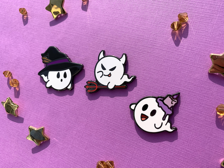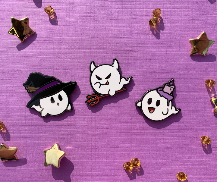 These Black Nickel Hard Enamel Ghosty Pins are around 1.25 in in size. They feature three Ghosty Pals who would love to be your friends! They close with a butterfly clasp.