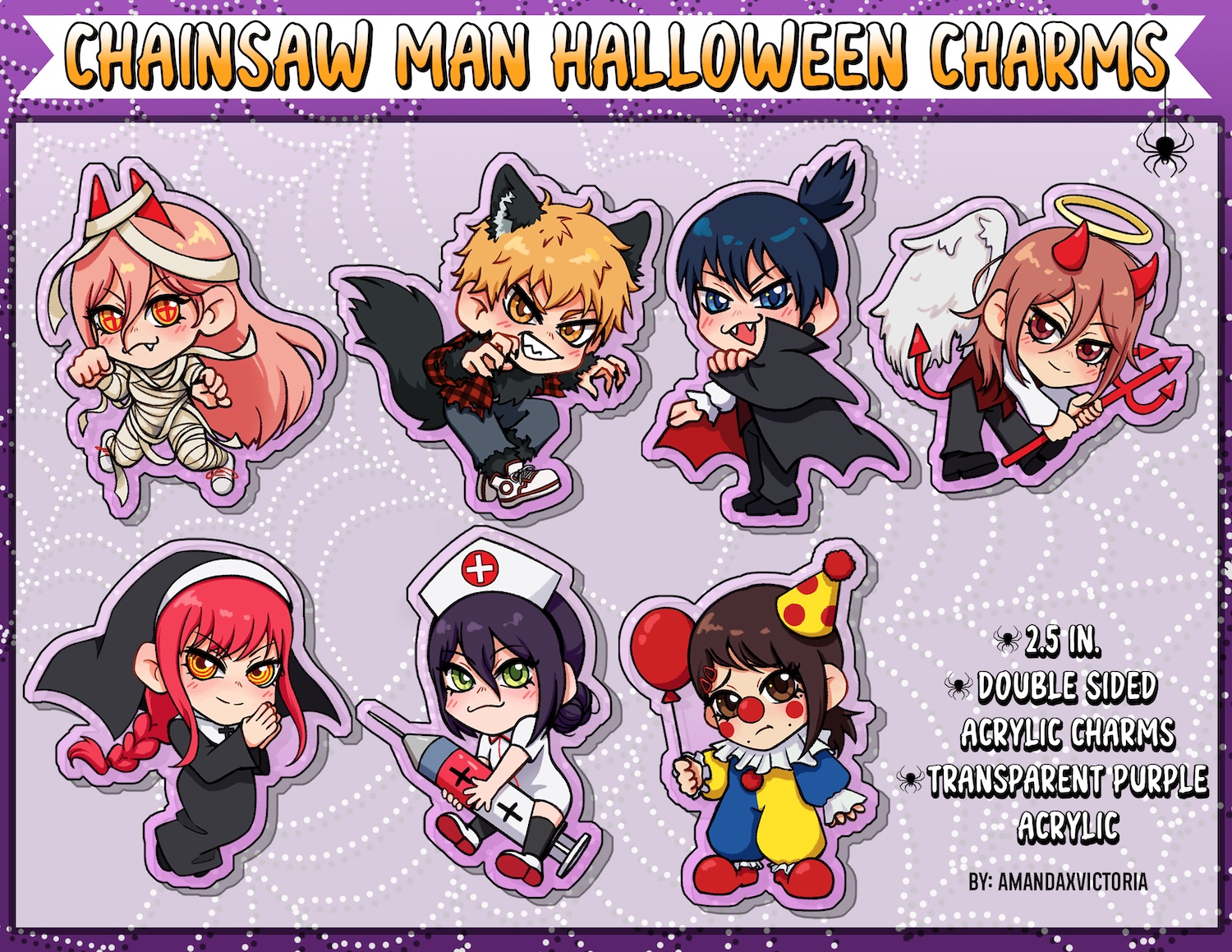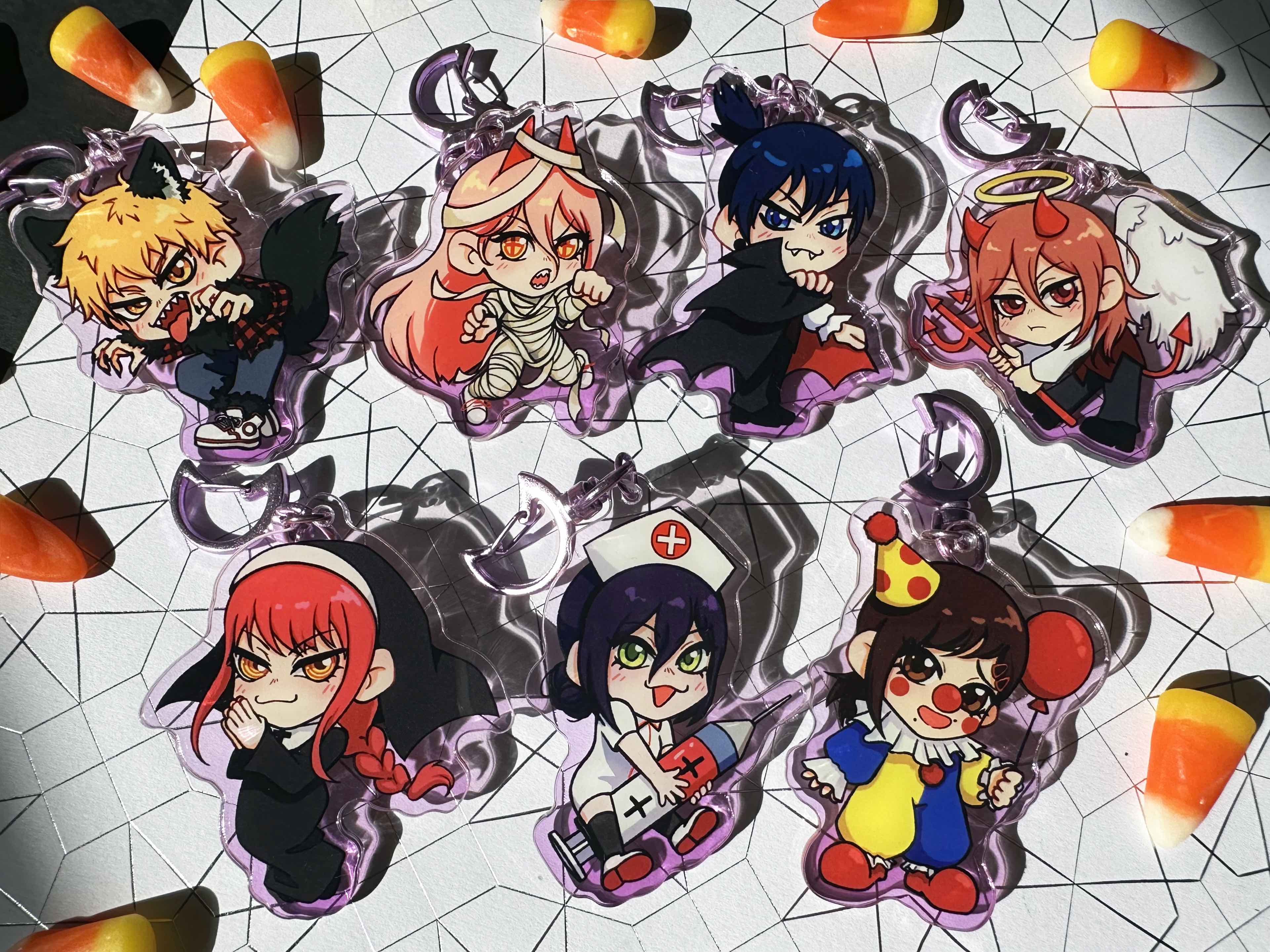 2.5 in Acrylic Charms! Featuring the chainsaw man characters dressed up for Halloween!